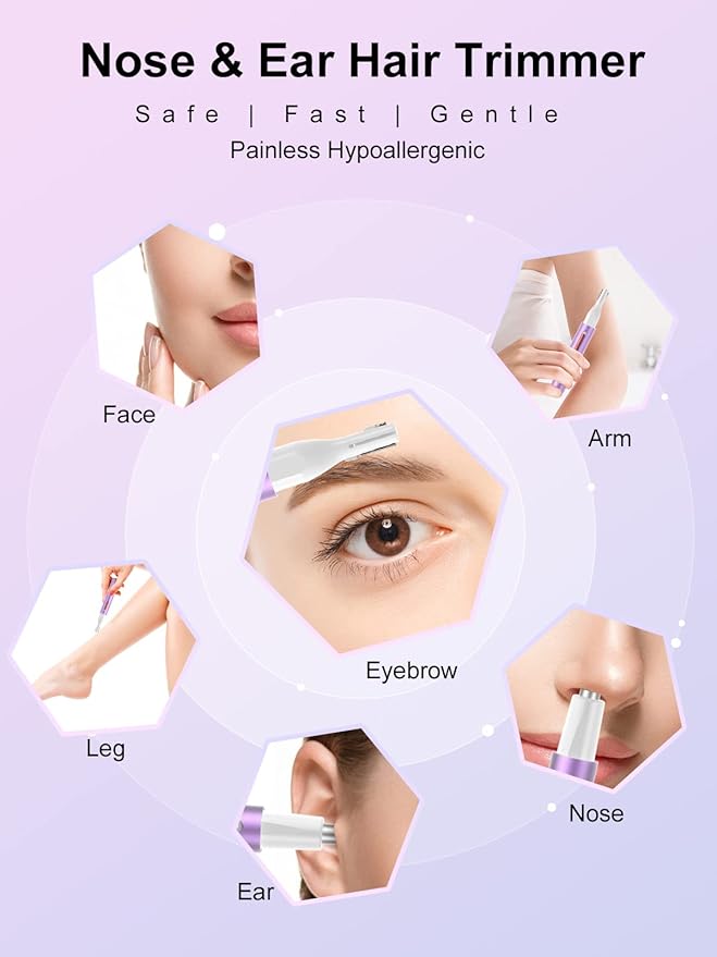 - 【Multifunctional Nose Hair Trimmer】: This 5 in 1 face trimmer including eyebrow trimmer,nose hair trimmer,ear hair trimmer and bikini razor,easy to replace,no noise, comfortable and quiet,meet your needs at different.