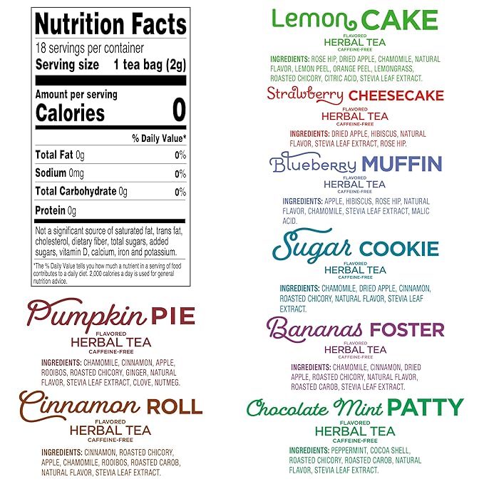 - BREWING YOUR TEA – Enjoy our dessert tea without having to worry about the ingredients. Our tea bags include herbal teas bursting with flavor, our new naturally flavored Sweet Temptations teas are deliciously rich and contain zero calories — the definition of guilt-free indulgence! Enjoy the full assortment of flavors!
