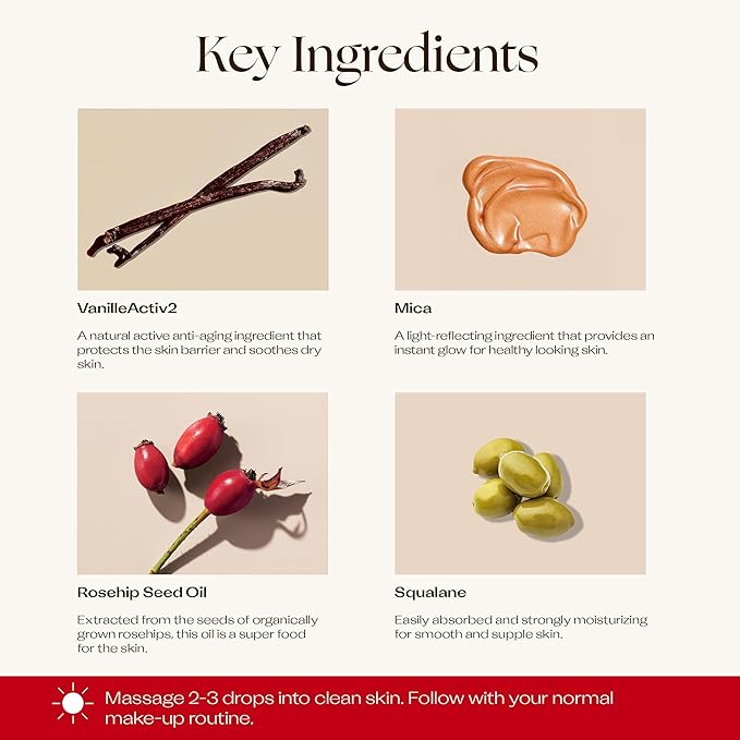 - Active Ingredients : Rosa canina (rosehip) seed oil, Caprylic/caprictriglyceride,Persea gratissima (avocado) oil, Simmondsia chinensis (jojoba) seed oil, Helianthus annuus (sunflower) seed wax, Squalane, Limnanthes alba (meadowfoam) seed oil, Mica, Glyceryl caprylate, Macadamia integrifolia (macadamia) seed oil, Vanilla planifolia (vanilla) fruit extract, Parfum(fragrance),Tocopheryl acetate (vitamin E), Helianthus annuus (sunflower) seed oil, Titanium dioxide (CI 77891), Iron oxide (CI77491), limonene*, linalool* *Components of natural essential oils, vitamin_e Rosa canina (rosehip) seed oil, Caprylic/caprictriglyceride,Persea gratissima (avocado) oil, Simmondsia chinensis (jojoba) seed oil, Helianthus annuus (sunflower) seed wax, Squalane, Limnanthes alba (meadowfoam) seed oil,… See more