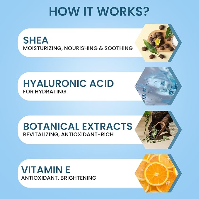 - š ANTI-AGING FORMULA: Contains Hyaluronic Acid and Shea Butter to smooth wrinkles and fine lines, promoting youthful skin.