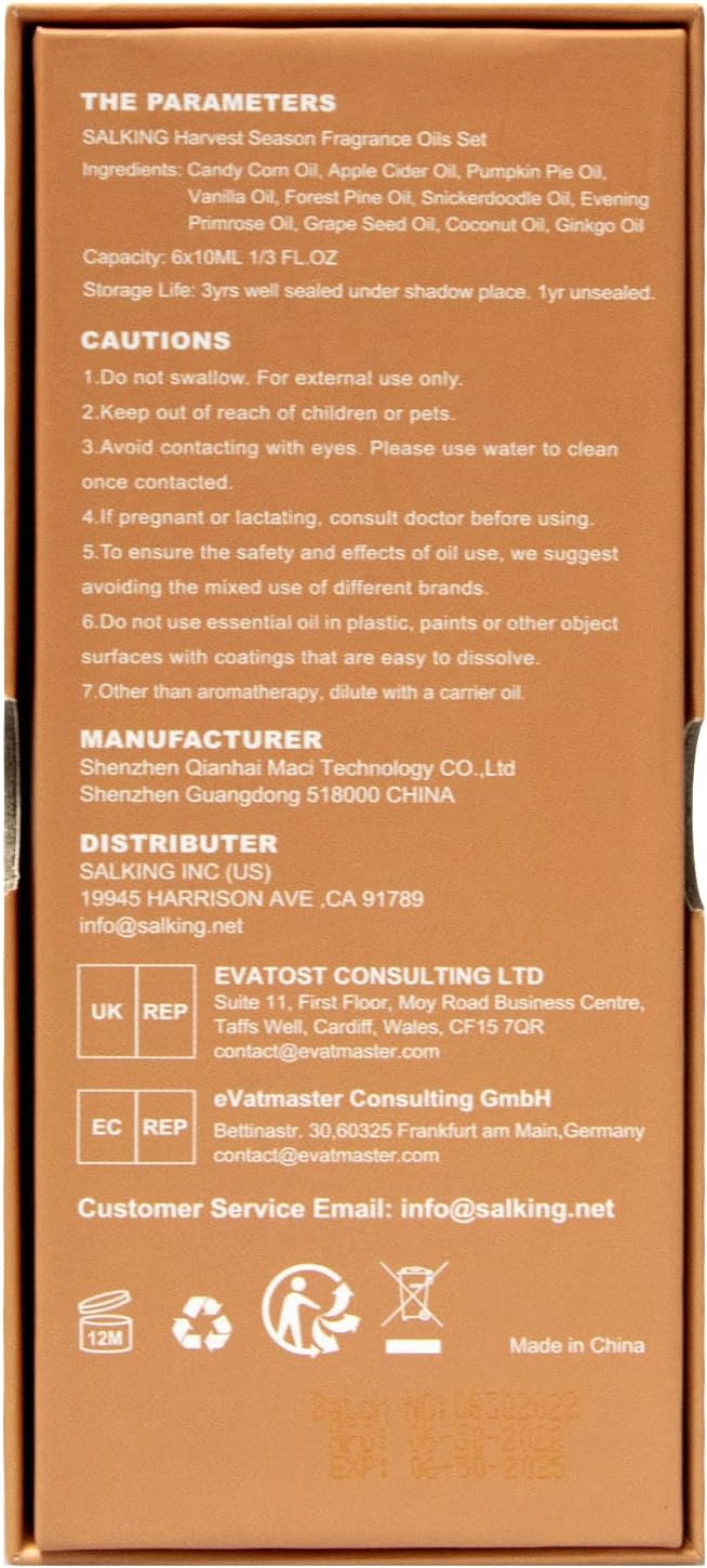 - Safety - We provide cozy fall fragrances and natural scents that you can enjoy all season long. SALKING premium grade fragrance oils are highly concentrated, enhanced formulations designed by our master perfumer. Our fall fragrance oils set are packaged in dark amber bottles to avoid scents diminishing due to light. And meet rigorous quality standards which are vegan friendly and zero testing on animals. Please note that these scented oils are for external use only.
