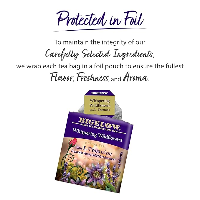 - Bigelow Whispering Wildflowers Herbal Tea Plus L-Theanine, Supports Stress Relief & Relaxation, Caffeine-Free, Kosher, Gluten Free & Non-GMO, 18 Tea Bags, 0.9 Ounce (Pack of 6)
