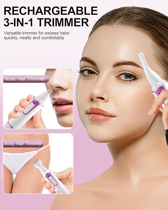 - 【MULTIFUNCTIONAL & VERSATILE】: With its 3-in-1 design, this trimmer for women is not just limited to nose hair removal. It also includes removable trimmer attachments for eyebrow trimming and facial hair removal,body hair grooming, making it a versatile tool for all your grooming needs.