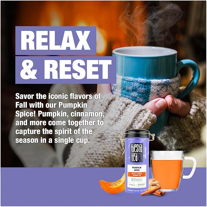 - SPICED PUMPKIN ROOIBOS TEA: Delight in the quintessential flavors of autumn with our Spiced Pumpkin Rooibos Tea. Immerse yourself in the warmth of Fall as real pumpkin, aromatic cinnamon, and a medley of spices converge, encapsulating the very essence of the season in a single, exquisite cup. Enjoy it hot or refreshingly iced, and relish the essence of summer with every sip.