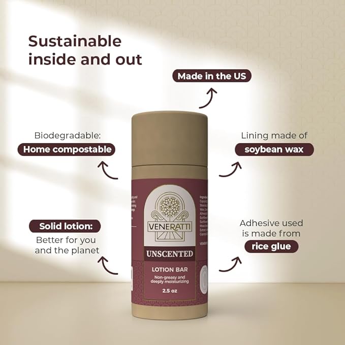 - Eco Friendly : packaged in a biodegradable container, our lotion bar eliminates the waste of traditional lotions that are made up of 80% water!