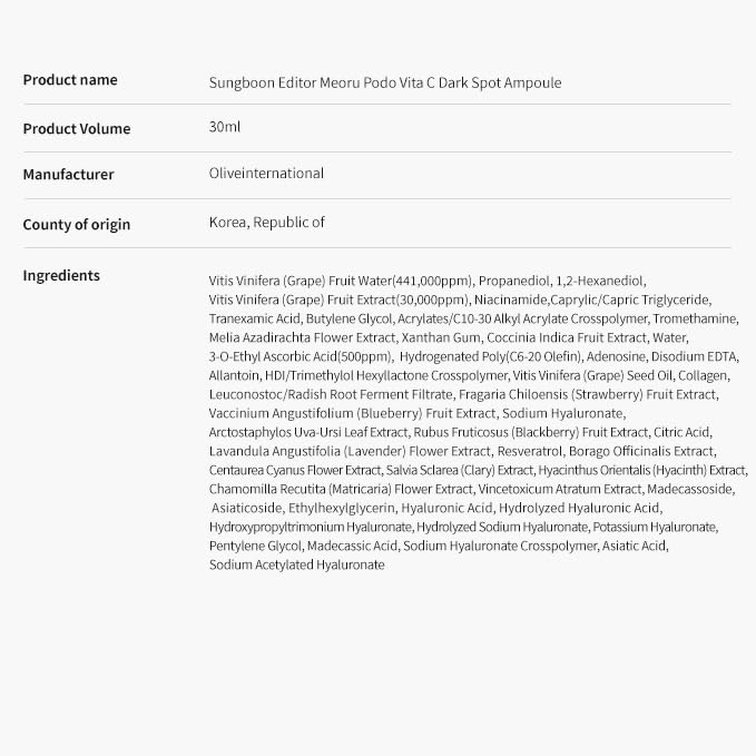 - [CONTAINS VITAMIN C] Combining Vitamin C derivatives with the antioxidant-rich grape extract provides a more effective whitening effect.
