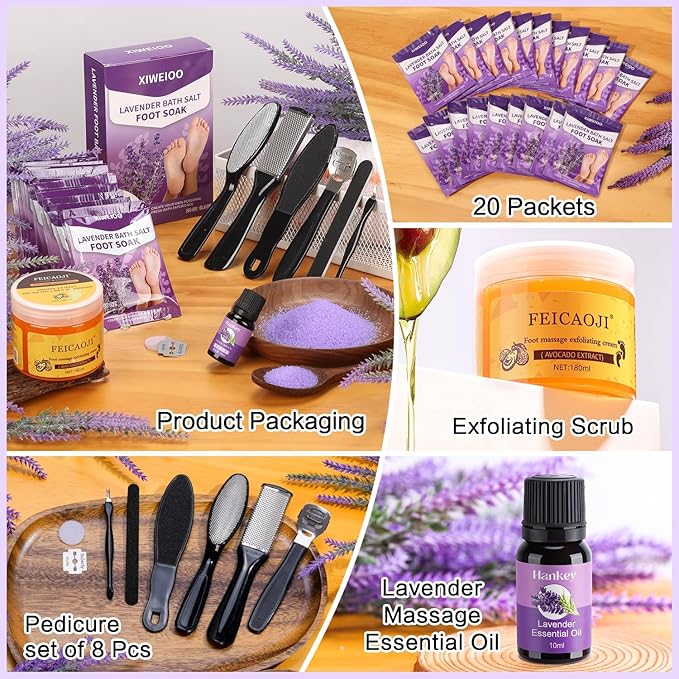 - š This product contains: 20 packs of lavender foot bath salts, 1 bottle of exfoliating scrub, Foot bath tool set 8 sets, 20 packs of lavender foot bath bath salts, 1 bottle of exfoliating scrub, foot bath tool set 8 sets, Lavender essential oil bottle. This set is a family foot bath set that meets all your needs for a massage spa foot bath at home. Improve the overall health and appearance of your feet and nails. Gentle, suitable for all skin types.