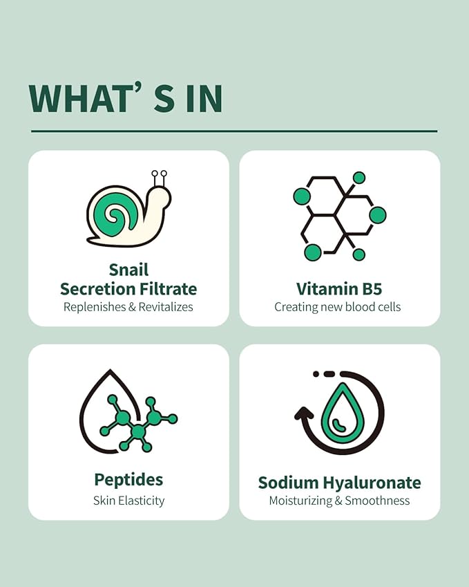 - Active Ingredients : Snail Mucus, Peptide, Hyaluronic Acid