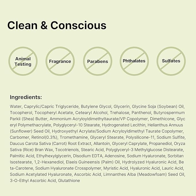 - Retinol 0.3% Cream: Retinol helps reduce signs of aging such as fine lines and wrinkles to achieve smoother, firmer, and more youthful-looking skin. It helps renew and resuface the skin and leaves the face glowing with radiance.