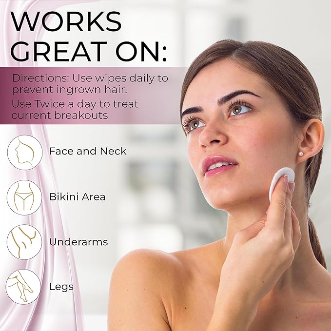 - Soothing Ingrown Hair Pads for Bikini & Body: Designed for sensitive areas like the bikini line, underarms, and face, these pre-soaked exfoliating pads help refresh and smooth the skin, reducing irritation caused by shaving and waxing.