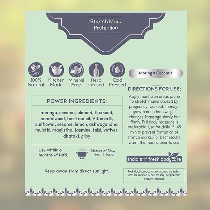 - Supports Skin Elasticity: Moringa is rich in vitamins that support skin elasticity, while coconut oil provides deep hydration. Together, they help improve the look of stretch marks and contribute to a smoother, more even skin appearance.