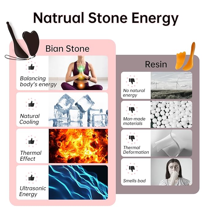 - 【Balancing Energy, Inside Out】Bian Stone Gua Sha Scraping Massage Tool is crafted from natural materials and enhances skin care with its thermal effect boosting blood circulation. Bian Stone's magnetic energy calms the mind. The natural cooling effect after freezing can better swelling. An ideal alternative to plastic Gua Sha and ice rollers for skin care.