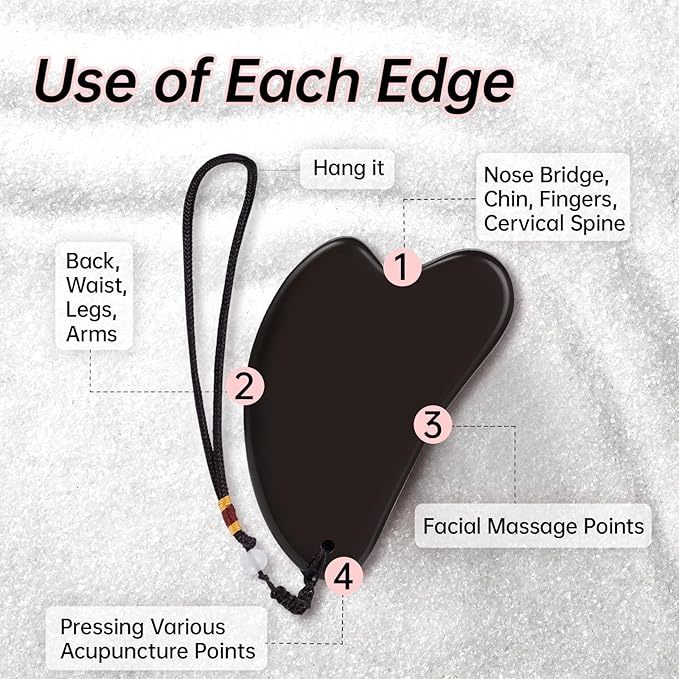 - 【Use of Gua Sha】Each side of the Gua Sha and Acupuncture Scraper serves a unique purpose for the face, eyes, neck, and body. Our Gua Sha set is much thicker so it doesn't hurt the skin and will work better. A small Gua Sha yields multiple effects – firming the face, reducing eye swelling, relaxing neck muscles, alleviating limb swelling, and acupressure point.