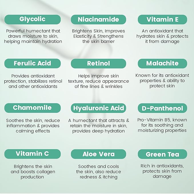 - Retinol Serum: The Retinol serum is formulated with 5% pure Retinol, which is a retinoid that helps stimulate collagen production and cell turnover. Retinol also helps reduce the appearance of fine lines, wrinkles, and dark spots. This serum also contains hyaluronic acid, which helps hydrate and plump the skin, reducing the appearance of fine lines and wrinkles.