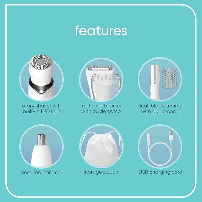 - Four Interchangeable Attachments: an ear/nose trimmer, an eyebrow trimmer, hypoallergenic rotary shaver for removing fine facial hair, and a multi-use trimmer.