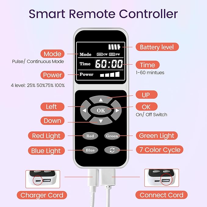 - 💕Multi-functional Led Mask Skincare: Power: 25% 50% 75% 100%, 4 levels adjustable; Time: 1 to 60 minutes adjustable; Mode: CW-continuous wave and PW-pulsed wave at 50Hz(There is evidence proven that PW is superior to CW for most application). Plug the infrared face mask into the power cord, long press OK for 2-3 seconds to turn on/off device, quick tap of OK to start/pause device, Up/Down to choose Mode/Time/Power. Press the Red/Green/Blue for 7 colors; Cycle for choosing 8 different light modes.