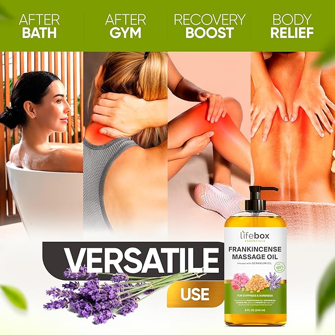 - FRANKINCENSE MASSAGE OIL FOR MASSAGE THERAPY – Our 100% Natural formula, expertly crafted to help alleviate soreness & stiffness. With its easy absorption and natural aroma, this oil helps eases tension while leaving your skin feeling deeply nourished and moisturized.