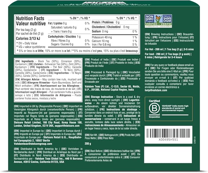 - 100 FULL-LEAF PYRAMID TEA BAGS - Gone are the days of paper tea bags that tear up in the brew. 1 pouch of Sweet Cinnamon Masala Chai Tea contains 100 sturdy pyramid-shaped tea bags for a fresher, flavorful brew. Preparation: 1 tea bag | 200 ml hot water | 3 - 5 mins