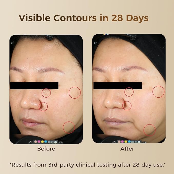 - VOICE OF CUSTOMERS: After 28 days, users reported visible improvements in facial contours: +13.55% jawline lift, +4.37% fuller cheeks, +43.18% skin elasticity boost, -13.69% nasolabial folds reduction.