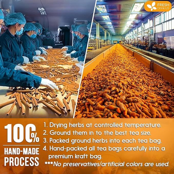 - ☘️ TURMERIC CINNAMON TEA BAGS MADE BY A HAND-MADE PROCESS: Turmeric and Cinnamon tea are picked at their flavorful/colorful peak and naturally sun-dried and roasted to perfection. We hand-select only the premium herbs for the utmost quality. Then we grind them into the best tea size. Next, we immediately pack it in eco-friendly tea bags. Lastly, we pack the tea bags into food-grade kraft bags for ultimate freshness.