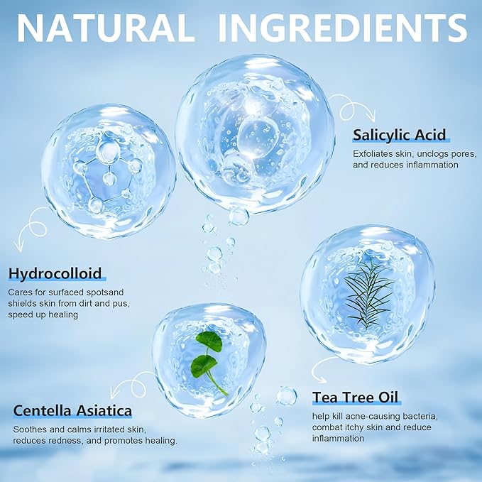 - 【Natural Ingredients】: Our acne patches contain natural ingredients such as tea tree oil (to soothe, calm, and tighten pores), salicylic acid (to reduce acne and exfoliate), and Centella (Moisturizes the skin and reduces inflammation). These pimple patches for face are highly effective in absorbing pus from acne and whiteheads, speeding up the process of acne elimination