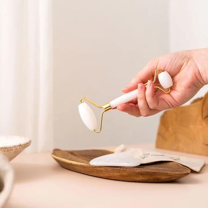 Gua Sha and Jade Roller Set for Facial Massage – Skin Care Tools to Reduce Puffiness and Redness, Perfect Self-Care Gift for Men and Women (White)