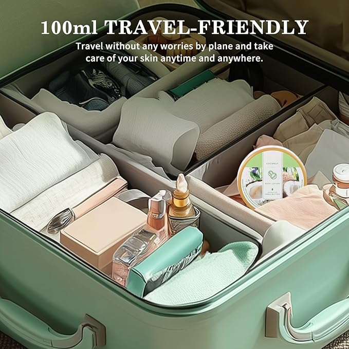 - TRAVEL-FRIENDLY: This Coconut Body Lotion is designed for travel convenience. It has a capacity of 100ml and is small and exquisite, making it easy to carry in a bag or suitcase. You can travel without the burden of flying and take care of your skin at any time. It is a considerate travel companion.