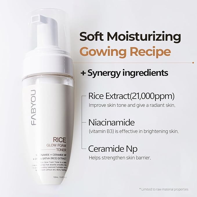 - STEP 1. Rice Glow Foam Toner: This rich, creamy-textured toner absorbs gently into the skin, hydrating and soothing it for a refreshed, glowing appearance.