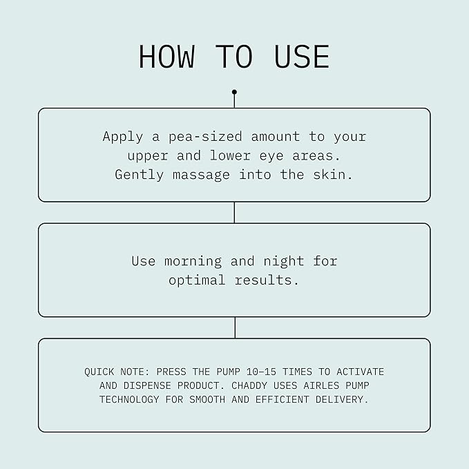 - SEAMLESSLY FITS INTO ANY ROUTINE: Use it AM, PM, or anytime your eyes need a pick-me-up. Just tap a small amount under clean eyes and gently massage until absorbed. For an extra cooling effect, store in the fridge or pair with Chaddy’s Reusable Eye Masks to lock in benefits and boost absorption.