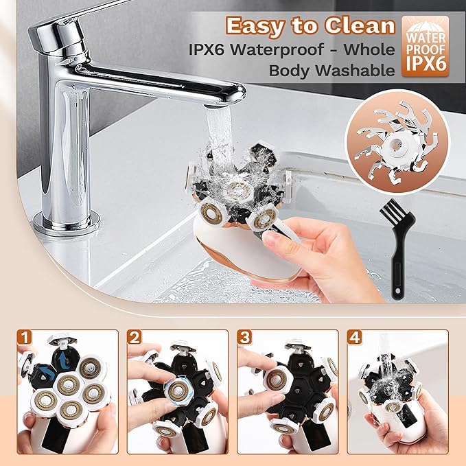 - 【Upgraded 7D Floating Blades】Compared with other 5D floating blades, our 7D wrap-around floating blades allow our lady shaver to automatically adapt to the contours of your hands, legs, head, face, neck and even chin. Providing you with a comfortable and efficient shaving experience. Rounded head design is acne-friendly and perfectly protects skin from nicks and cuts. 360°Gentle, painless and clean hair removal.