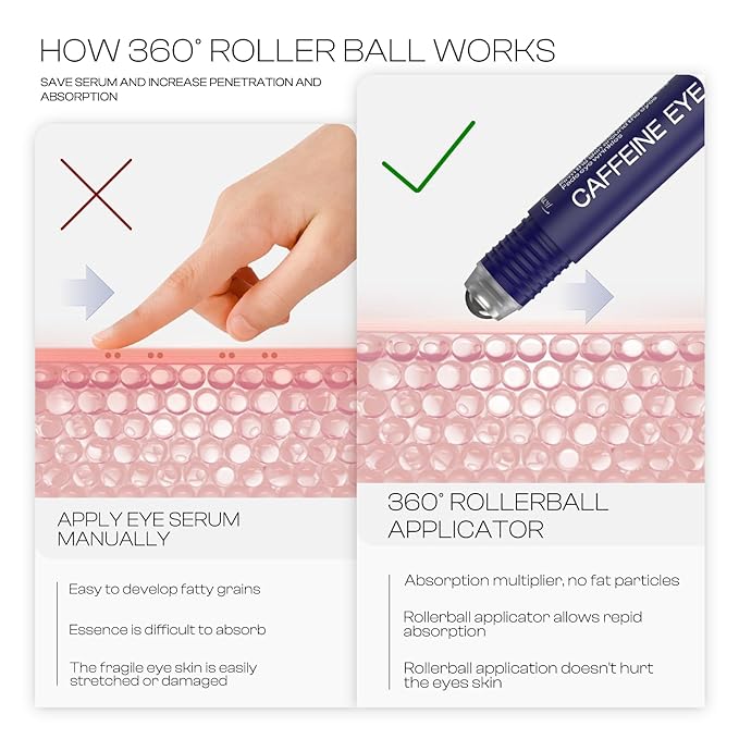 - Eye 360°Roller for Puffy Eyes: Our eye cream features a cooling roller that smoothly applies the serum, instantly soothing tired eyes and reducing puffiness.